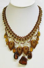 This admirable necklace is a hand-made piece of fancy jewelry containing 100% genuine Baltic amber in various hues - champagne, honey and cognac. Larger amber stones are connected with tiny honey amber beads. Quite a fashionable necklace that features a bar ring closure made out of amber. Necklace is about 26" long. Beads vary in size, color, and shape. Large central beads measure approx. 1.5" long. Imported from Russia. Total weight - 34.2 gr.