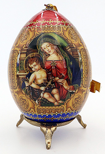 This wood ornament was handcrafted in Russia. The ornament is approximately 3.5" tall and comes with a ribbon ready to hang. Production of this Christmas ornament involves a combination of hand painting and decoupage.
