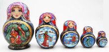 This gorgeous matryoshka was hand made well and expertly hand painted with the tiniest of detail. This is a beautiful five nest set of dolls with Russian Fairy tales. The nesting doll is very rich decorated with silver and gold flowers. The dolls have a glossy lacquer finish and the largest doll in the set measures approximately 6" tall. Signed by the artist - Igor Kolbasuk.