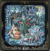 Blue greenish tones of tempera paints dominate here as the action takes place in winter. The costumes of the characters, the architecture, the sledge, the harness of the steeds are skillfully detailed with gold and silver paints.