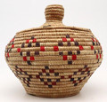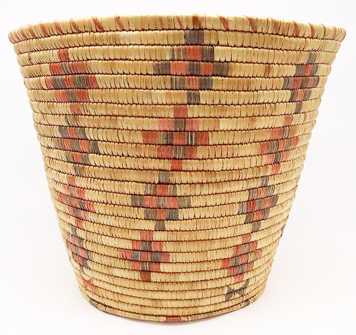 This is a wonderful vintage Hooper bay Native American Yupik Alaskan woven unlidded basket, traditional grass weave, geometric design. This medium weave lidded basket is woven from wild rye beach grass (taperrnat). It is decorated with a complex geometric design of red and black dyed grass. It is expertly woven, tightly coiled, symmetrical and well balanced. It is 10” high by 11.5" in diameter. It is in excellent condition.