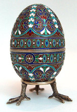 This is an antique Russian silver egg and stand. The egg is decorated with multi-colored shaded cloisonne enamel. The stand takes the form of three chicken feet. Approximately 3" tall and 2" in diameter. The total height, including the stand is approximately 3.3". Made in Moscow circa 1908-1917. The egg opens at the center and is marked with the silver quality mark "84" on the interior of both halves along with a right facing kokoshnik and the delta symbol for the city of Moscow. The initials "AAT" in Latin letters also appear on each half of the egg. These are the maker's marks for an unknown Russian silversmith. The stand has the silver quality mark "84". This piece is in excellent condition overall with no noted loss of enamel.
