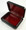 The box is constructed from paper-mache. Black lacquer is used to paint the exterior of the box while red lacquer completes the interior of the work. The lid is hinged from the left of the composition, and the box rests flat. The work is signed with the artist's name. Approx. 2.5"x3.5"x1".