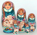 A pretty little set of five nesting dolls representing the Snowmaiden with two cheerful snowmen painted on the front. The dolls are beautifully painted and have a glossy lacquer finish. The largest doll is approximately 6.25" tall. Handcrafted in Russia and signed by the artist.