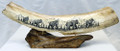 Artist George Vukson engraved this scene with two walking mammoths into a mounted piece of fossil mammoth ivory using a traditional technique. The base is shed caribou antler. The ivory piece is approx. 6" x 2" (wide side). Signed by the artist.